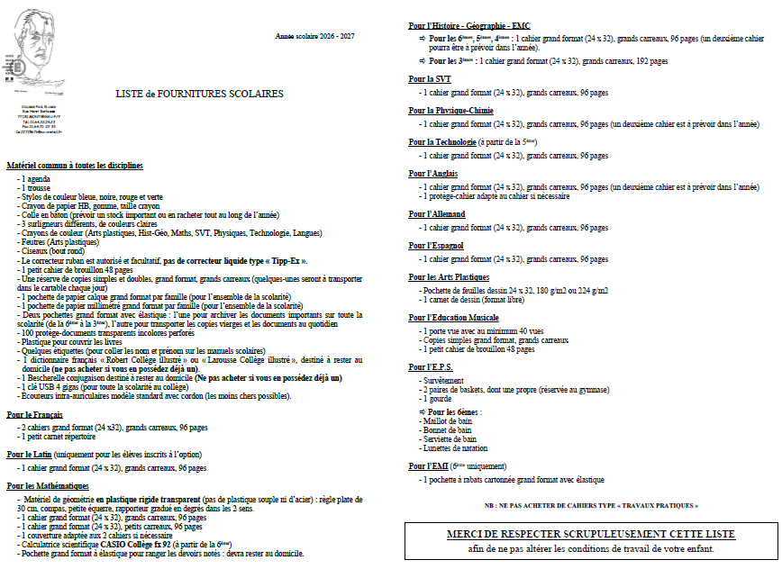 Liste des fournitures 2026-2027 à télécharger